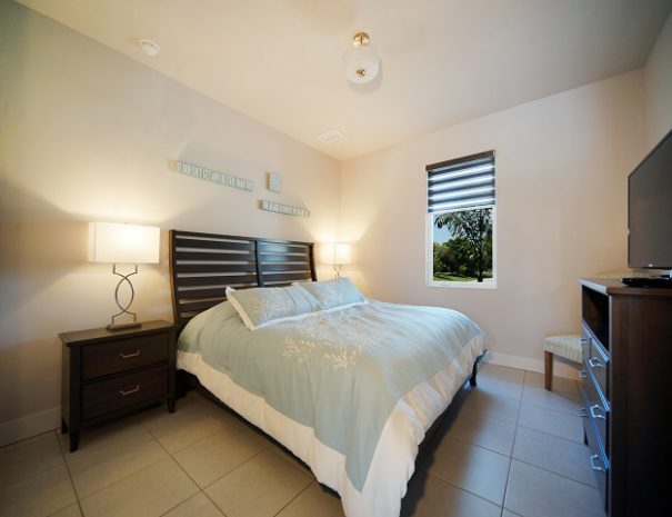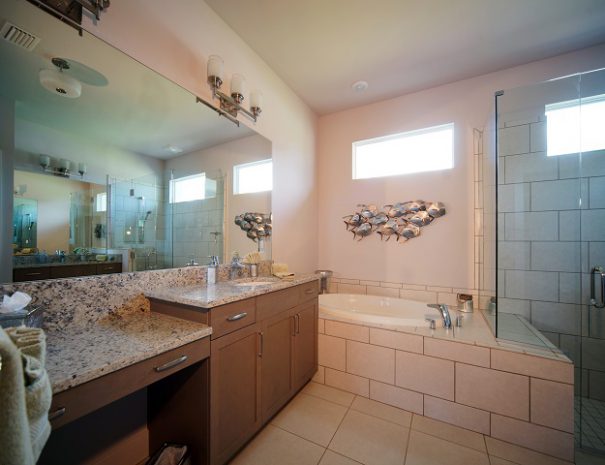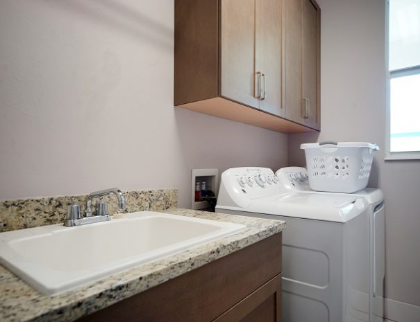 The living room, kitchen with quartz island and counters and dining area are in the middle house area. Of course, each bedroom has its own LED TV and in the living room a large curved LED flat screen with BlueRay player and Bose sound system. Laundry room with washer and dryer are also available.