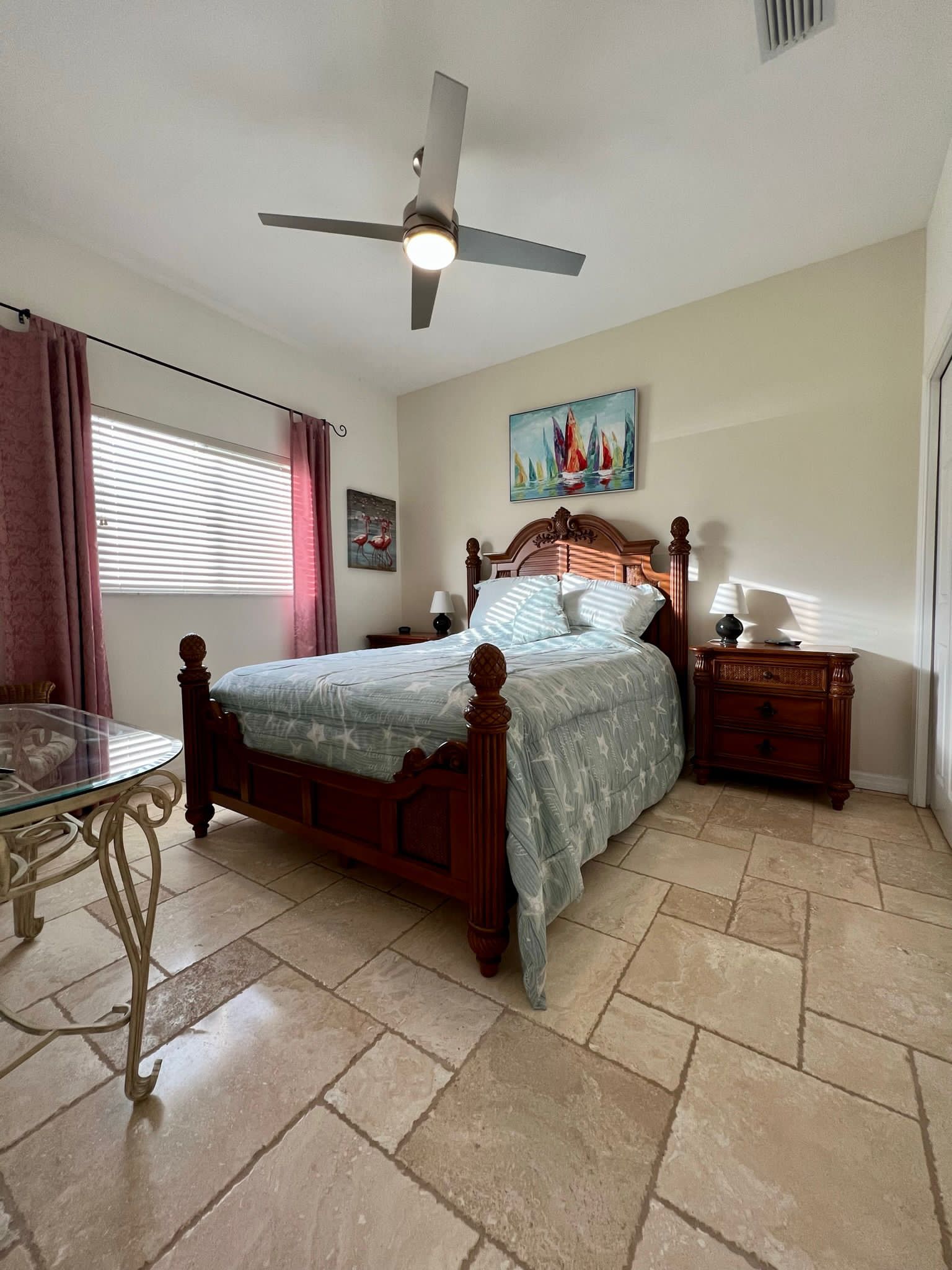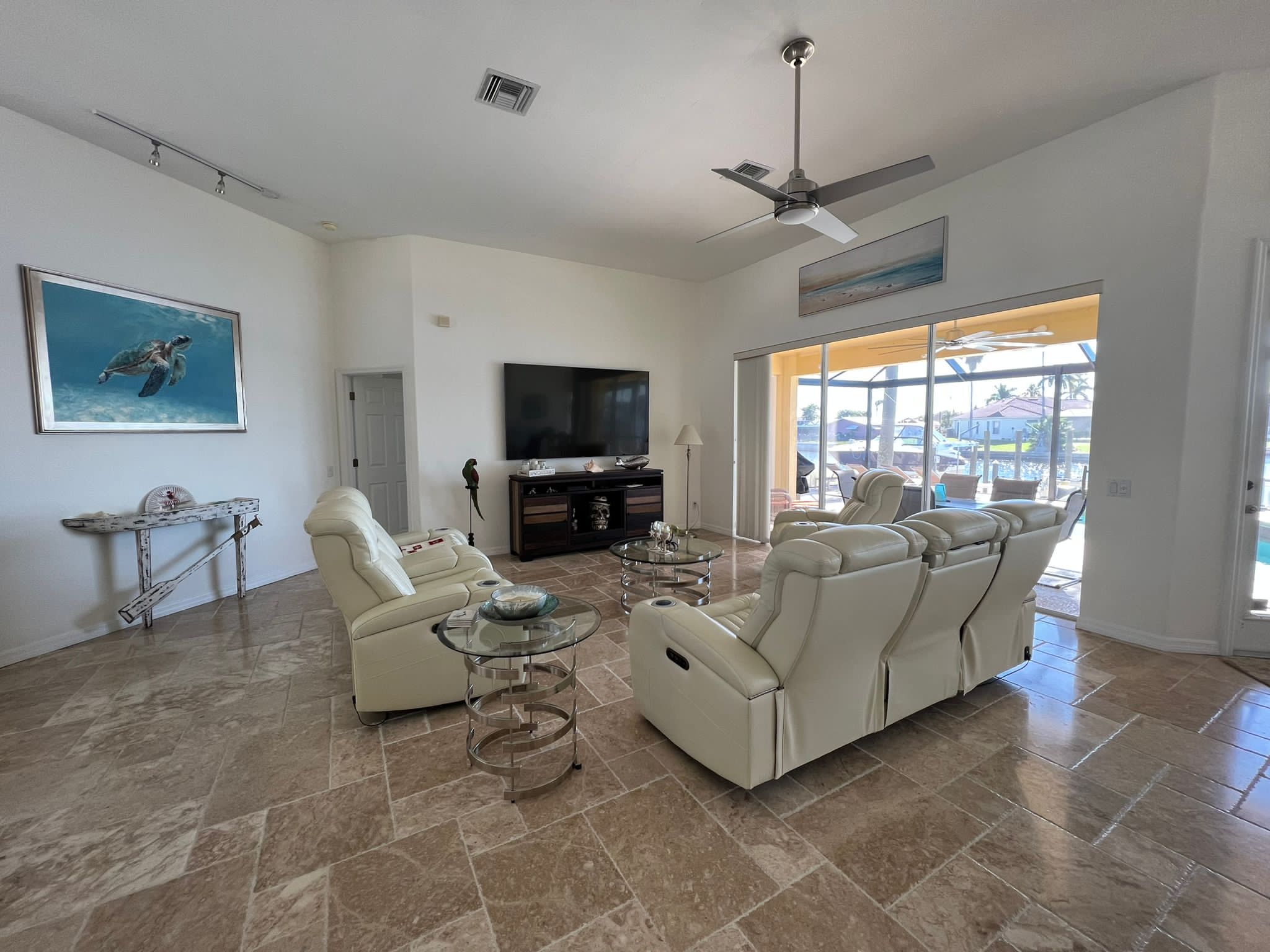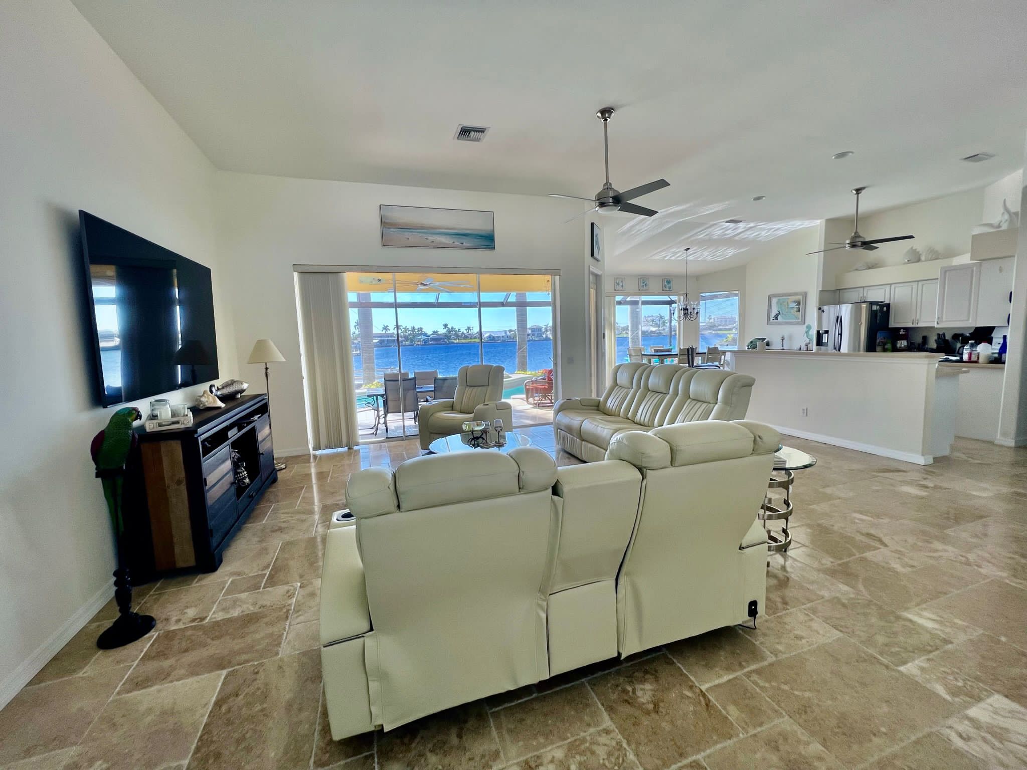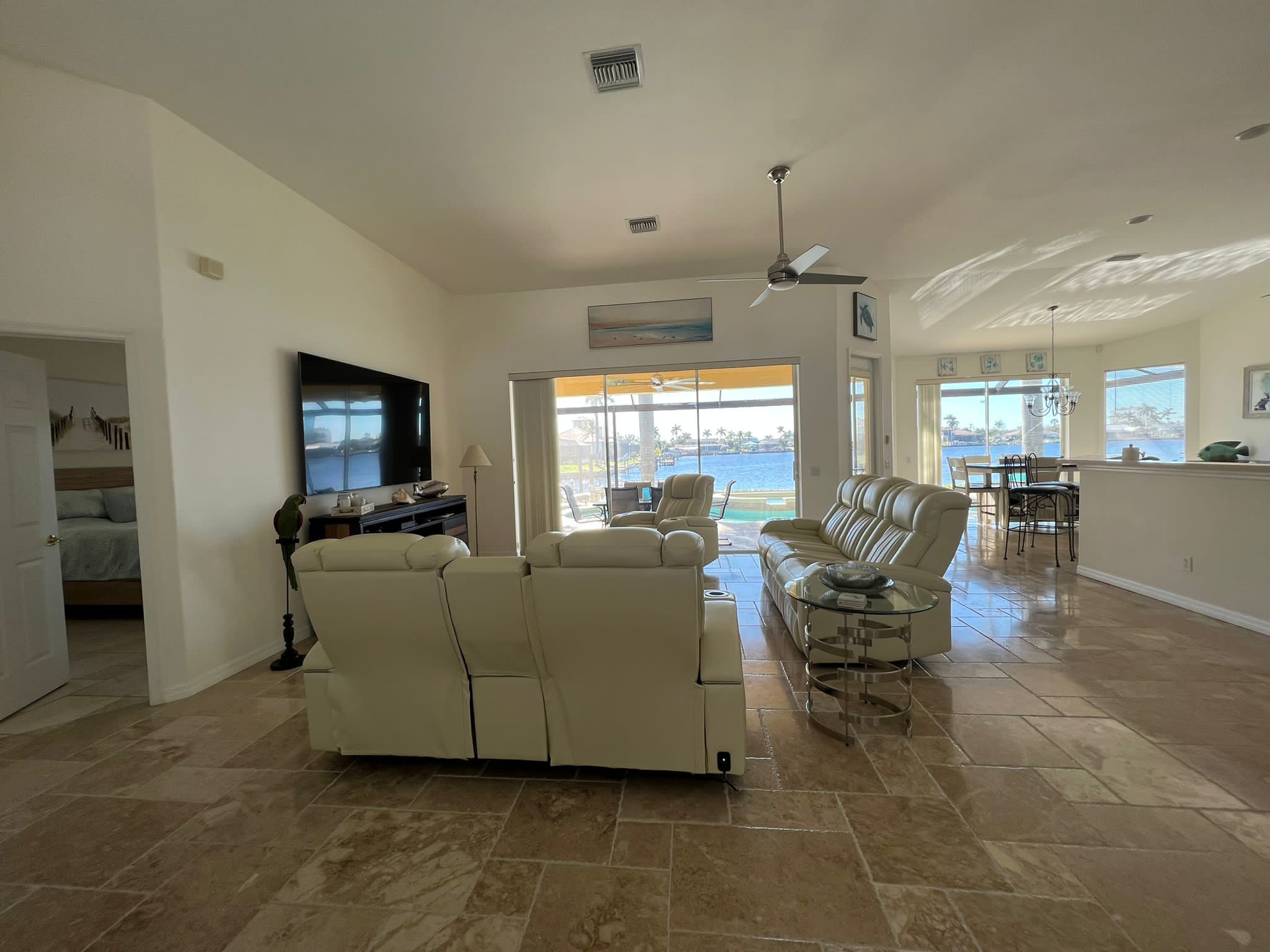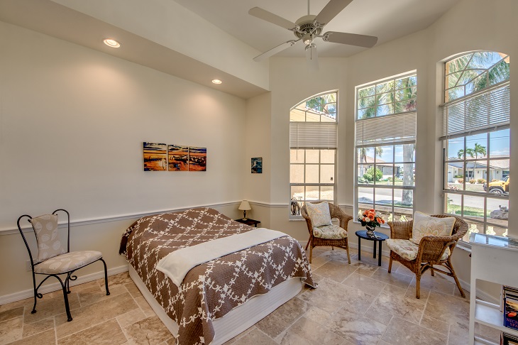 Drei Schlafzimmer und ein Büro mit einer zusätzlichen Schlafgelegenheit bieten ausreichend Platz für bis zu 7 Gäste. Direkt vom Masterschlafzimmer gelangen Sie in das große Masterbad mit geräumiger Dusche und Badewanne. Das Masterschlafzimmer und ein weiteres Schlafzimmer, ebenfalls mit Kingbett haben einen direkten Zugang zur Terrasse.