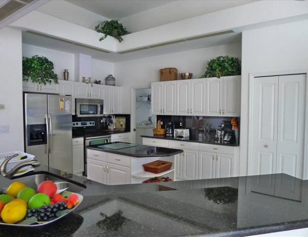 Die Küche hat schwarze Granit-Arbeitsplatten und ist komplett ausgestattet. Fliesenboden und Laminatboden in allen Schlafzimmern.